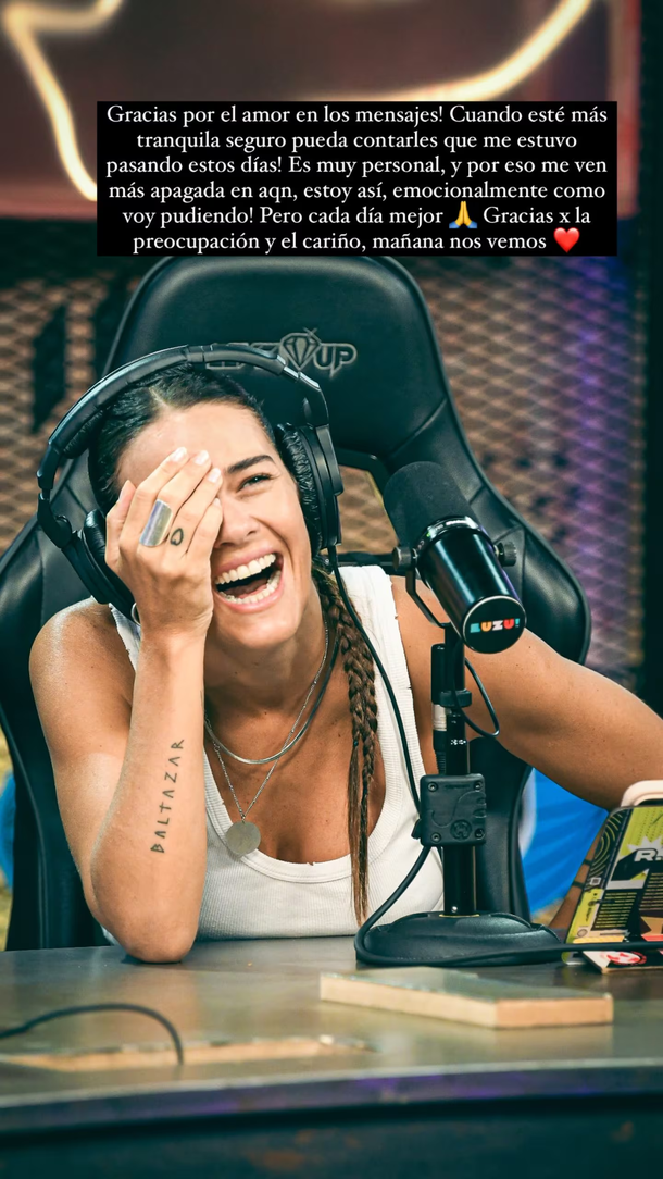 En este sentido, la presentadora de "El Gran Premio de la Cocina" (El Trece) se expresó a través de una historia en su cuenta de Instagram, donde intentó llevar tranquilidad a sus fans y explicar el difícil trance que vive: "¡Gracias por el amor en los mensajes! Cuando esté más tranquila seguro pueda contarles qué me estuvo pasando estos días", comenzó indicando.