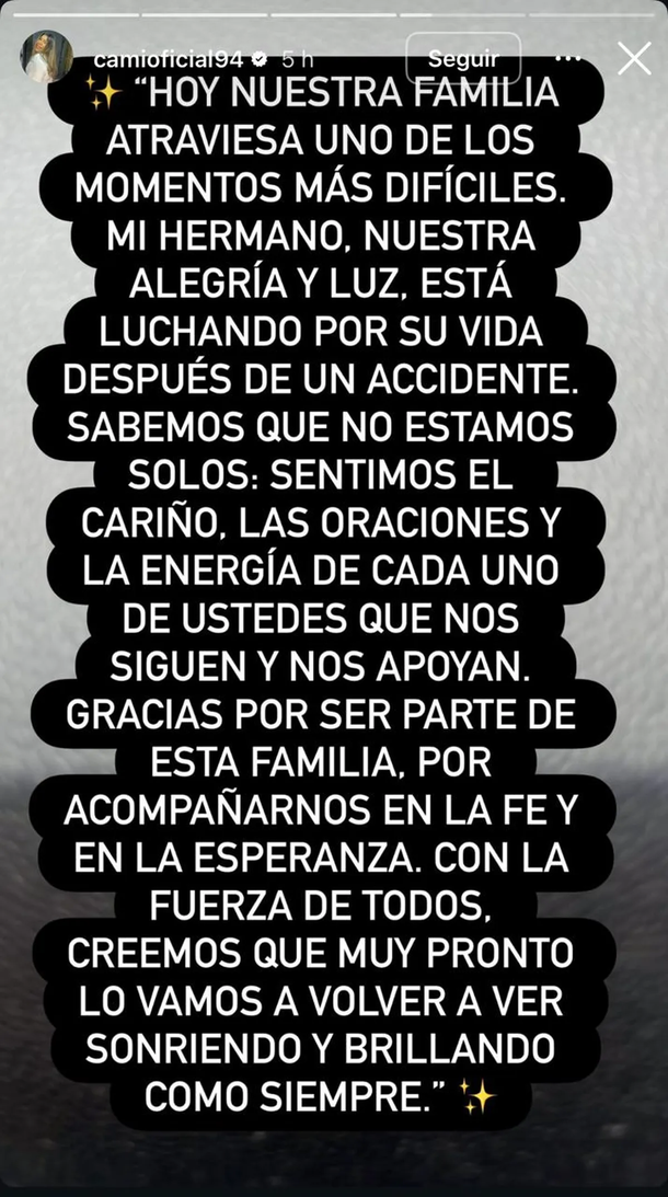 "Sabemos que no estamos solos: sentimos el cariño, las oraciones y la energía de cada uno de ustedes que nos siguen y nos apoyan. Gracias por ser parte de esta familia, por acompañarnos en la fé y en la esperanza. Con la fuerza de todos, creemos que muy pronto lo vamos a volver a ver sonriendo y brillando como siempre".
