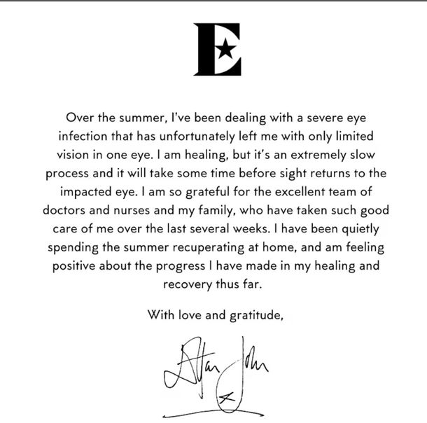“Estoy muy agradecido con el excelente equipo de médicos y enfermeras y con mi familia, que me han cuidado tan bien durante las últimas semanas. Pasé el verano tranquilamente recuperándome en casa, y me siento positivo por los progresos que he hecho hasta ahora en mi curación y recuperación. Con amor y gratitud, Elton John”, escribió a sus casi 5 millones de seguidores. Elton John ya se había retirado de los escenarios en el 2023 para priorizar tiempo con su marido David Furnish y sus hijos Zachary y Elijah.