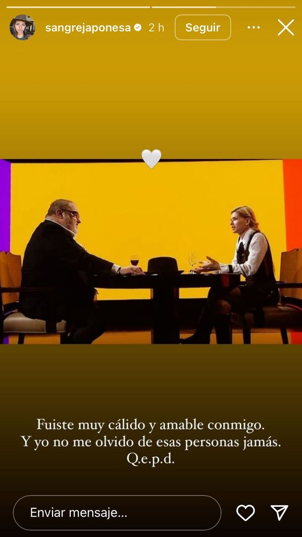 Entre todas las personalidades que se pronunciaron al respecto de su deceso, Eugenia China Suárez también quiso expresar su dolor mediante un sentido mensaje en sus historias de Instagram. Con el recuerdo de una entrevista llevada a cabo en 2019, la actriz escribió: "Fuiste muy cálido y amable conmigo", compartió con una foto de aquel momento. Finalmente, agregó: "Y yo no me olvido de esas personas jamás. QEPD (Que en paz descanses)".
