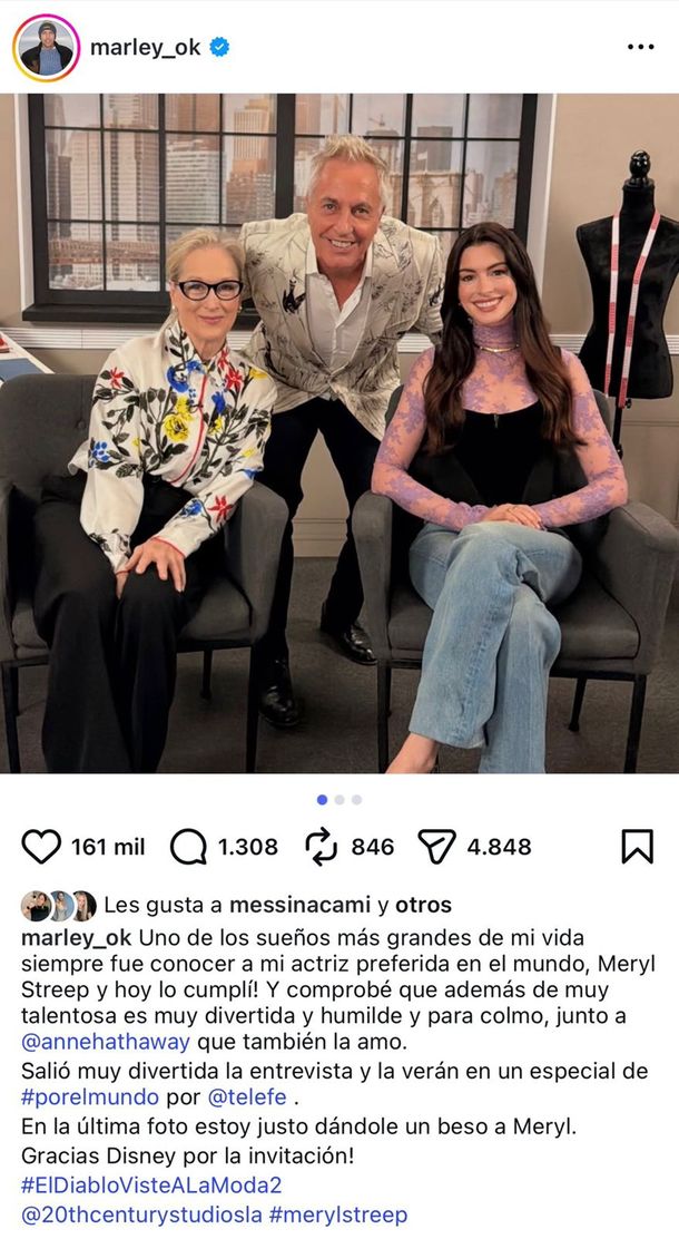 Por su parte, Marley también expresó su emoción en Instagram tras conocer a las figuras de Hollywood. El conductor publicó fotos junto a Meryl Streep y Anne Hathaway y escribió: "Uno de los sueños más grandes de mi vida siempre fue conocer a mi actriz preferida en el mundo, Meryl Streep, y ¡hoy lo cumplí!".