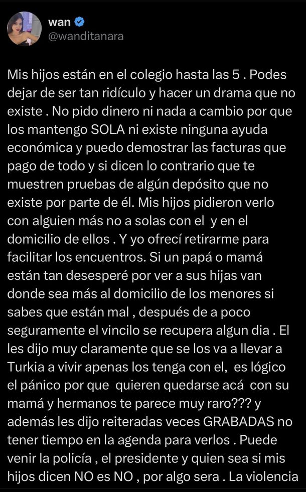 En este sentido y tras continuar sin entregarle las nenas al futbolista, la mediática se descargó en redes sociales, pero después decidió borrar su extenso posteo: "Mis hijos están en el colegio hasta las 5. ¿Podés dejar de ser tan ridículo y hacer un drama que no existe? No pido dinero ni nada a cambio por que los mantengo SOLA ni existe ninguna ayuda económica y puedo demostrar las facturas que pago de todo y si dicen lo contrario que te muestren pruebas de algún depósito que no existe por parte de él", comenzó indicando Wanda.