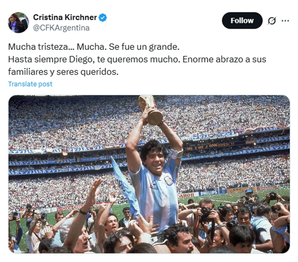 De hecho, del mismo modo que Diego fue cercano a Néstor Kirchner y participó en su funeral en 2010, Cristina despidió al astro en 2020 con profundo cariño: "Mucha tristeza. Mucha. Se fue un grande. Hasta siempre Diego, te queremos mucho. Enorme abrazo a sus familiares y seres queridos".