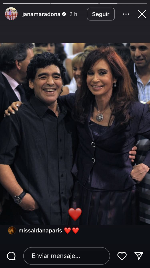 Una vez trascendida la resolución de los ministros, Jana Maradona sorprendió a sus seguidores al expresar su apoyo a la expresidenta: publicó en sus historias una foto de Cristina junto a Diego Maradona, con un emoji de corazón, dejando en claro que respalda a la líder política pese al adverso fallo del máximo tribunal.