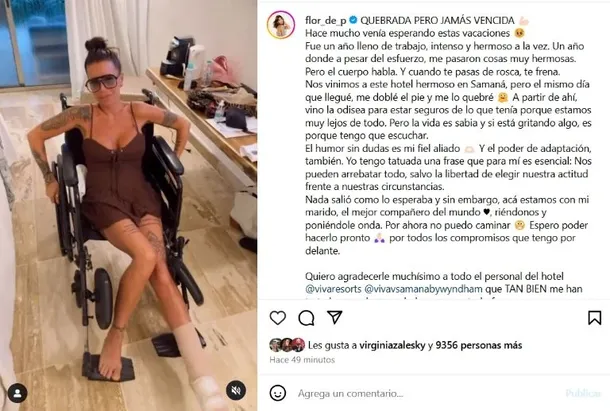 Con el humor como estandarte, Florencia Peña se mostró en una silla de ruedas y con el pie vendado. A su vez, al video que compartió, le sumó un comunicado explicando lo que pasó. “Quebrada, pero jamás vencida”, escribió la actriz. Y sumó: “Hace mucho venía esperando estas vacaciones. Fue un año lleno de trabajo, intenso y hermoso a la vez. Un año donde, a pesar del esfuerzo, me pasaron cosas muy hermosas. Pero el cuerpo habla. Y cuando te pasas de rosca, te frena”.