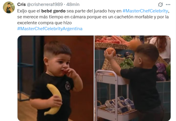 Pero mientras la preparación avanzaba en el estudio, las redes sociales explotaban. La actitud de Benja se volvió viral en cuestión de minutos: usuarios de X y TikTok comenzaron a publicar memes, videos y comentarios llenos de ternura. “El bebé gordo tipo: no son suficientes naranjas”, “Derretida por el bebé gordo”, “Exijo que el bebé gordo sea parte del jurado”, “Lo amo”, fueron algunos de los mensajes que multiplicaron la popularidad del pequeño.