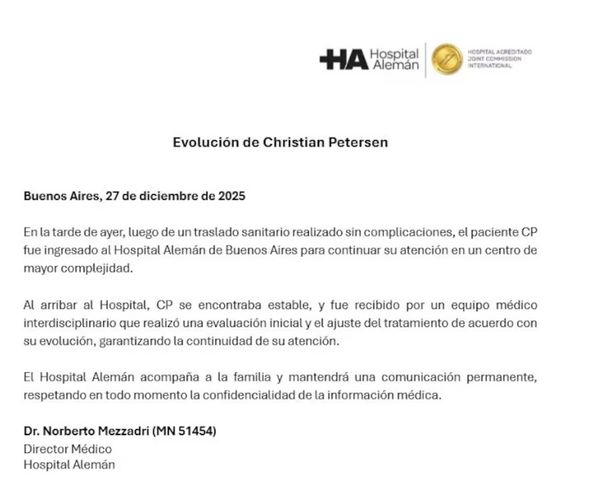 Según detalló el comunicado del hospital, “en la tarde de ayer, luego de un traslado sanitario realizado sin complicaciones, el paciente Christian Petersen fue ingresado al Hospital Alemán de Buenos Aires para continuar su atención en un centro de mayor complejidad”. En ese sentido, el equipo médico que recibió al conductor realizó una evaluación inicial completa y ajustó el tratamiento según su evolución, asegurando la continuidad de los cuidados que venía recibiendo durante su internación en la Patagonia.