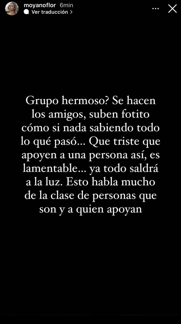 La influencer realizó un duro descargo a través de sus historias de Instagram, donde acusó a Juan Martino de un supuesto abuso sexual. “Grupo hermoso? Se hacen los amigos, subiendo una fotito como si nada sabiendo todo lo que pasó. Qué triste que apoyen a una persona así, es lamentable”, escribió molesta.
