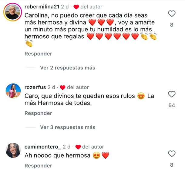 "Caro, qué divinos te quedan esos rulos. La más hermosa de todas"; "¡No recuerdo haberte visto con rulos! Sos una diosa"; "Meee enncaanntaaannn los rulos, esa sonrisa es icónica, hermosa, perfecta"; "Me encantan esos rulos, Pampa, qué bellísimos te quedan mi Pampa... me hacés acordar a una actriz de Hollywood", fueron solo algunos de los muchos mensajes cariñosos que sus fans dejaron en la publicación.