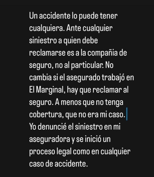Y continuó: "Un accidente lo puede tener cualquiera. Ante cualquier siniestro a quien debe reclamarse es a la compañía de seguro, no al particular. No cambia si el asegurado trabajó en El Marginal, hay que reclamar al seguro. A menos que no tenga cobertura, que no era mi caso. Yo denuncié el siniestro en mi aseguradora y se inició un proceso legal como en cualquier caso de accidente".
