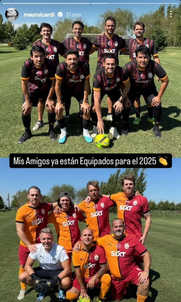 En sus historias de Instagram, el jugador compartió una imagen en la que se lo veía disfrutando de una tarde de fútbol con amigos. Aunque él no pudo participar del partido debido a que sigue recuperándose de la rotura de ligamentos en la rodilla, acompañó desde las gradas y mostró su apoyo al equipo regalando camisetas titulares y suplentes del Galatasaray.