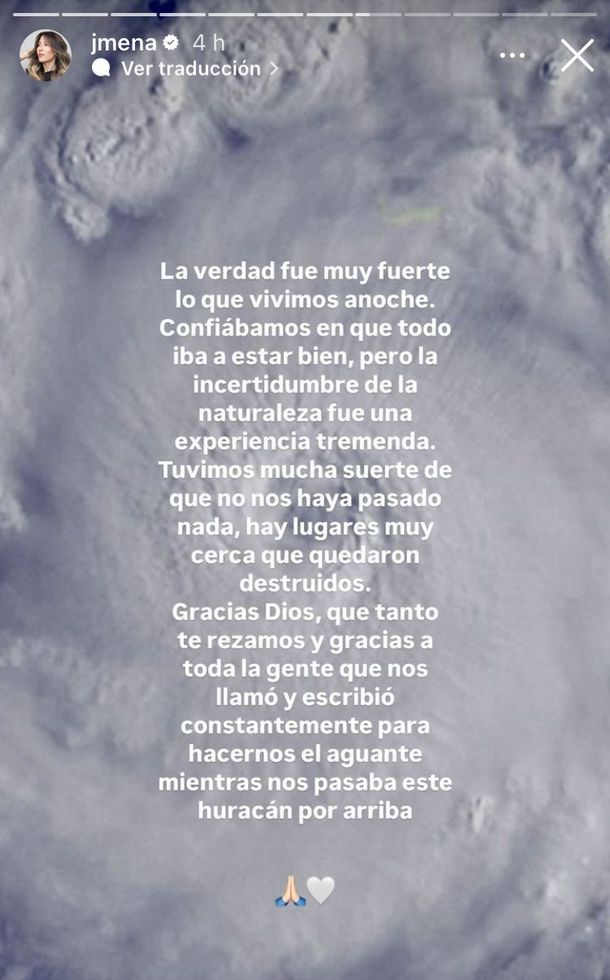 A través de su cuenta de Instagram, Jimena publicó un mensaje para describir lo que vivió entre la noche del miércoles y la madrugada del jueves: “La verdad que fue muy fuerte lo que vivimos anoche”, confesó. Luego continuó: “Confiábamos en que todo iba a estar bien, pero la incertidumbre de la naturaleza fue una experiencia tremenda”, relató con honestidad sobre su paso por Estados Unidos.