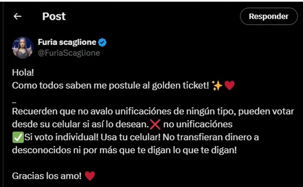 “¡Hola! Como todos saben, me postulé para el Golden Ticket. Recuerden que no avalo unificaciones de ningún tipo. Pueden votar desde su celular si así lo desean. No unificaciones, sí voto individual”, expresó Furia en sus redes sociales. Luego, reforzó su mensaje con una clara advertencia: “Usá tu celular. No transfieran dinero a desconocidos, por más que les digan lo que les digan. Gracias, los amo”.