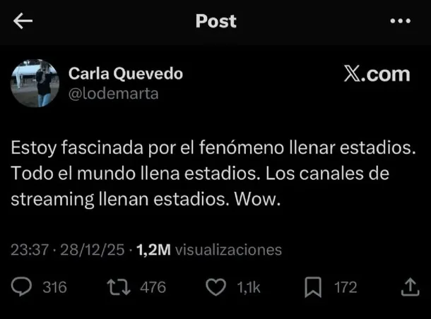 A pocos días de que Lali Espósito agotara dos fechas en el estadio de River Plate y ratificara su condición de figura central de la música popular argentina, una publicación en redes sociales volvió a encender la polémica. Carla Quevedo, actriz y escritora con pasado en el cine y la televisión —recordada por su participación en El secreto de sus ojos y por su rol protagónico en El Maestro, junto a Julio Chávez— compartió en X una reflexión sobre “el fenómeno de llenar estadios” que fue rápidamente asociada por los usuarios a la consagración reciente de la artista pop. El posteo, que no mencionaba nombres propios, fue interpretado como un “palito” directo a Lali y generó una ola inmediata de reacciones entre sus seguidores.