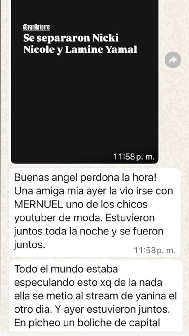El mundo del espectáculo se vio sacudido por un mensaje que se viralizó al instante: “Una amiga mía ayer la vio irse con Mernuel, uno de los chicos youtuber de moda. Estuvieron juntos toda la noche y se fueron juntos”. La declaración de Ángel de Brito, conductor de LAM, se replicó rápidamente en redes y chats de WhatsApp, sumando un nuevo episodio a la vida amorosa de Nicki Nicole, recién separada de Lamine Yamal.