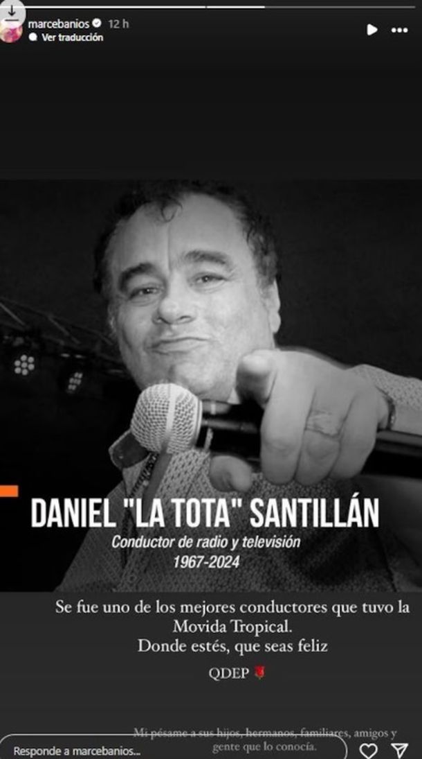 A pesar de que en los últimos años Baños y Santillán se habían distanciado por diversas razones, sorprendentemente, la conductora de Pasión de Sábado expresó su pésame a la familia de su colega: "Se fue uno de los mejores conductores que tuvo la movida tropical. Donde estés, que seas feliz. QEPD. Mis condolencias a sus hijos, hermanos, familiares, amigos y a todos los que lo conocían", escribió, acompañando con una foto en blanco y negro de La Tota.