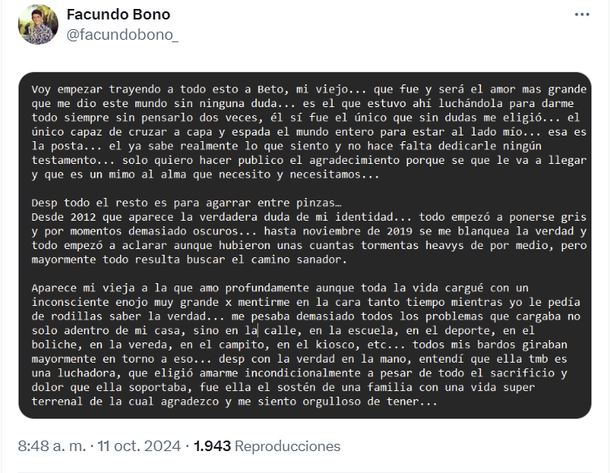 Fue a través de su perfil en X (ex Twitter) donde el joven decidió contar su verdad y ponerle fin a las especulaciones sobre su vida, con fuertes críticas al periodismo de chimento y, por el contrario, resaltando la importancia de mantener un buen vínculo con su padre.