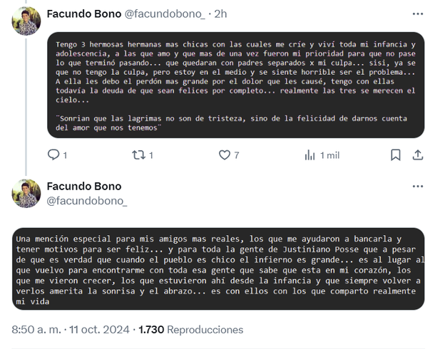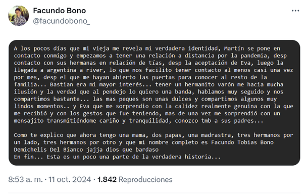 "Cómo te explico que ahora tengo una mamá, dos papás, una madrasta, tres hermanos por un lado, tres por otro y mi nombre completo es Facundo Tobías Bono Demichelis Del Bianco. Dios que bardazo. En fin, esta es un poco una parte de la verdadera historia...", sintetizó el ahora hijo mayor de Demichelis.