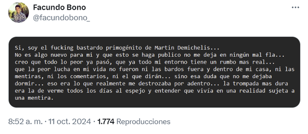 Luego confirmó: "Sí, soy el fucking bastardo primogénito de Martín Demichelis… No es algo nuevo para mi y que esto se haga público no me deja en ningún mal. Creo que todo lo peor ya pasó, que ya todo mi entorno tiene un rumbo más real, que la peor lucha de mi vida no fueron ni los bardos fuera y dentro de mi casa, ni las mentiras, ni comentarios, ni el qué dirán, sino esa duda que no me dejaba dormir. Eso era lo que realmente me destrozaba por dentro. La trompada más dura era verme todos los días al espejo y entender que vivía en una realidad sujeta a una mentira".