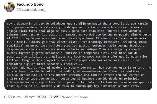 "Hola, mi nombre es Facu y con Martín hoy por hoy está la mejor. No quiero tener que darle bola a los medios, ni envenenarme por todas las mentiras. Odio al periodismo porque no les importa arruinar una familia entera con tal de contar un chisme mal contado que venda. posta que si hubiese querido desde un principio hubiera hecho todo muy diferente. Pero ni la plata ni la fama me importó más que las cosas que salen del corazón y de todo lo humano que hay alrededor de esto", cerró.