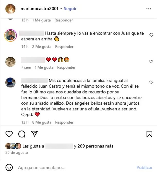 "Triste noticia. Abrazo al cielo a los dos y condolencias a su familia", "Hasta siempre y te vas a encontrar con Juan que te espera arriba", "Mis condolencias a la familia. Era igual al fallecido Juan Castro y tenía el mismo tono de voz. Con él se fue lo último que nos quedaba de recuerdo por su hermano. Dios lo reciba con los brazos abiertos y se encuentre con su amado mellizo. Dos ángeles bellos están ahora juntos en la eternidad. Vuelven a ser una célula... vuelven a ser uno. QEPD".