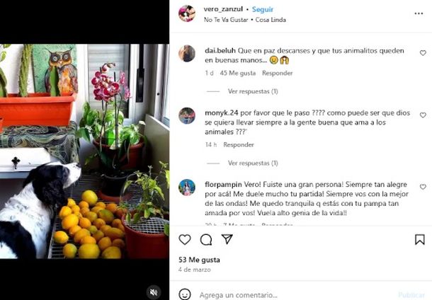 Los seguidores reaccionaron a su emotivo video con mensajes de despedida: “¿Por qué siempre se llevan a las personas buenas que aman a los animales?”, expresó uno de sus fans, mientras otro comentó: “¡Vero, fuiste una gran persona! ¡Siempre tan alegre! Me duele mucho tu partida”. También hubo quienes, más cercanos, hicieron referencia a su adorada mascota: “Espero que estés junto a tu querida Pampa, descansa en paz”.