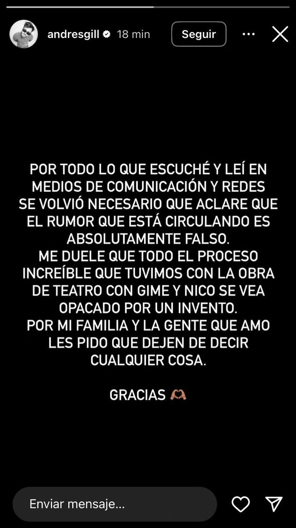 "Por todo lo que escuché y leí en medios de comunicación y redes se volvió necesario que aclare que el rumor que está circulando es absolutamente falso. Me duelo que todo el proceso increíble que tuvimos con la obra de teatro con Gime y Nico se vea opacado por un invento", comenzó indicando.
