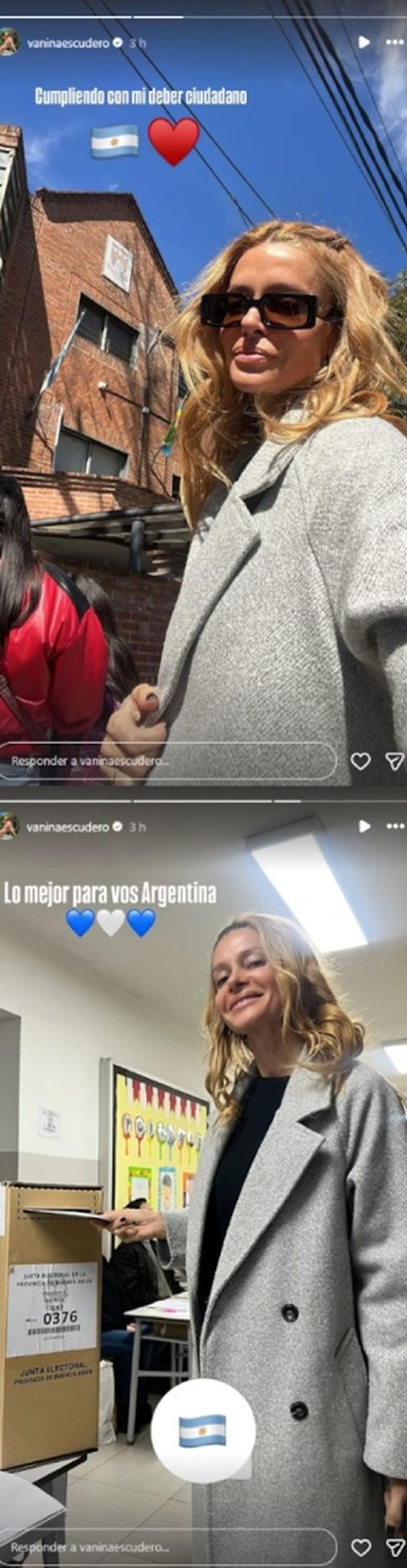 Vanina Escudero decidió subir una selfie rumbo al centro de votación. “Cumpliendo con mi deber ciudadano”, escribió, acompañando el texto con una bandera argentina y un corazón rojo. Más tarde, ya en el acto de votar, agregó: “Lo mejor para vos, Argentina”.