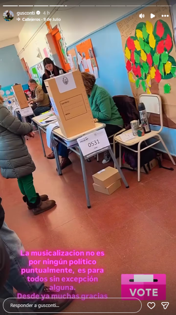 Gustavo Conti eligió musicalizar su publicación desde la escuela donde esperaba para votar. Utilizó el tema “9 de julio” de Callejeros y aclaró: “La musicalización no es por ningún político puntualmente, es para todos sin excepción alguna. Desde ya, muchas gracias”.