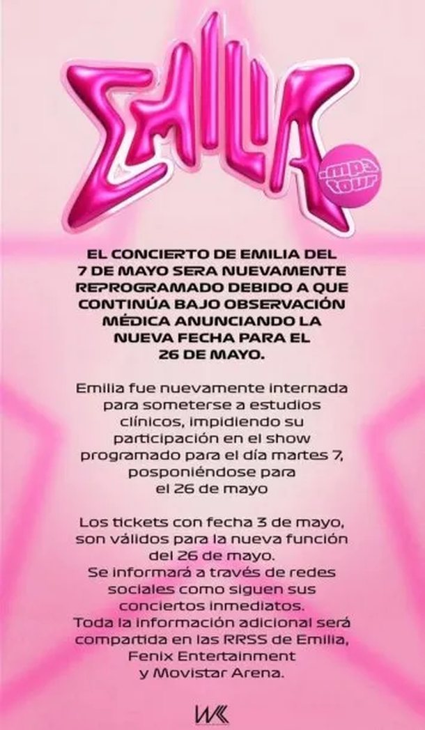 "El concierto de Emilia del 7 de mayo será nuevamente reprogramado debido a que continúa bajo observación médica anunciando la nueva fecha para el 26 de mayo", manifestaron desde la organización.