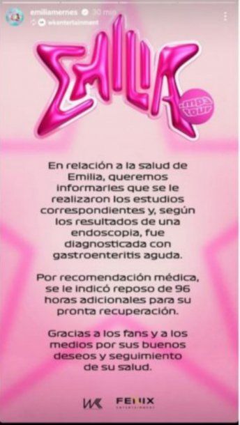 "En relación a la salud de Emilia, queremos informarles que se le realizaron los estudios correspondientes y, según los resultados de una endoscopía, fue diagnosticada con gastroenteritis aguda", dice el comunicado difundido en redes sociales.