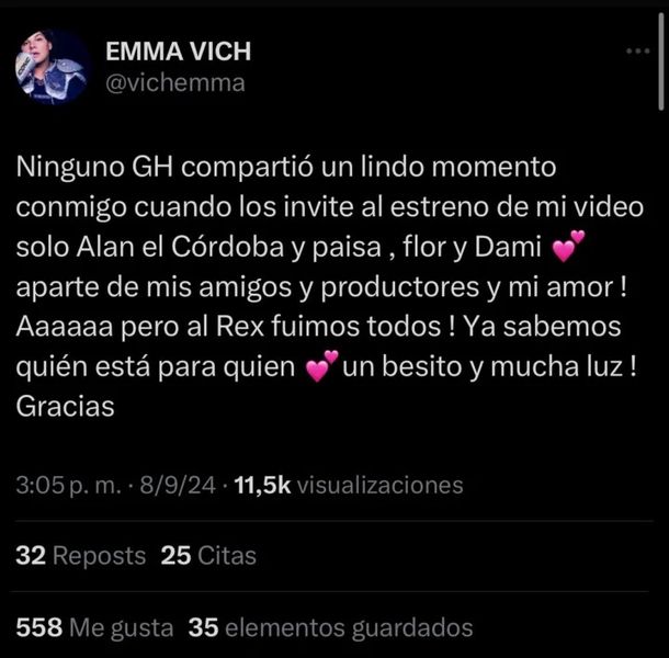 "Ninguno de GH compartió un lindo momento conmigo cuando los invité al estreno de mi video solo Alan de Córdoba y El Paisa, Flor y Damián, aparte de mis amigos, productores y mi amor". Luego de esto, agregó: "Ahhhh pero al Rex fuimos todos. Ya sabemos quién está para quien. Un besito y mucha luz. Gracias".