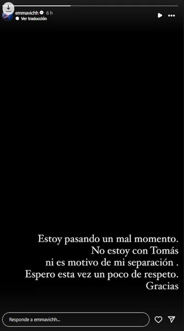 A través de una historia en su cuenta de Instagram (@emmavichh), Vich aclaró: “Estoy pasando un mal momento. No estoy con Tomás ni es motivo de mi separación. Espero esta vez un poco de respeto. Gracias”.