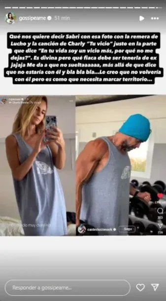 Minutos después, Pochi, de Gossipeame, habló sobre esta historia y dejó algunas frases picantes. “¿Qué nos quiere decir Sabri con esta foto con la remera de Lucho y la canción de Charly ‘Tu vicio’ justo en la parte que dice ‘en tu vida soy un vicio más, ¿por qué no me dejás?’”, escribió.