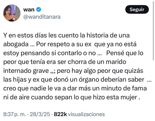 "Y en estos días les cuento la historia de una abogada… Por respeto a su ex que ya no está, estoy pensando si contarlo o no… Pensé que lo peor que tenía era ser chorra de un marido internado grave, pero hay algo peor que quizás las hijas y ex que donó un órgano deberían saber… creo que nadie le va a dar más un minuto de fama ni de aire cuando sepan lo que hizo esta mujer", escribió Wanda en su cuenta de X, apuntando a un mal obrar de la letrada con el fallecido Jorge Lanata.