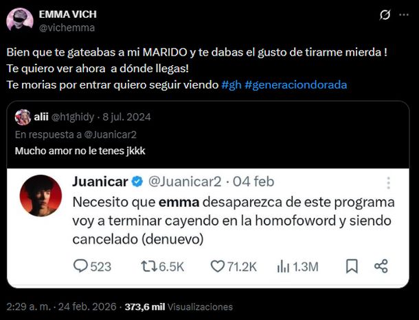 La polémica escaló cuando Emma Vich, finalista del ciclo 2023-24, apuntó directamente contra el actor y desató un escándalo en X. El cordobés expuso un conflicto personal con una frase demoledora: “¡Bien que te gateabas a mi marido y te dabas el gusto de tirarme mierda!“, lanzó, generando una ola de repercusiones.