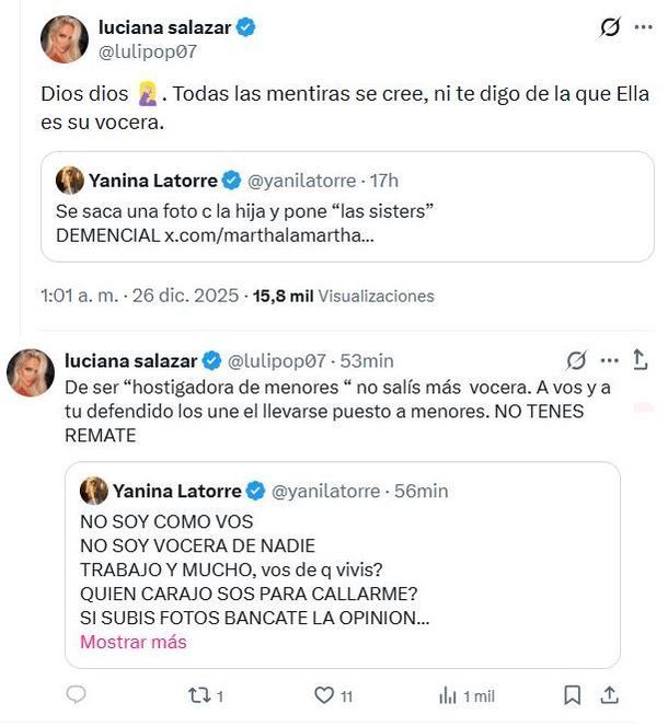 Cuando parecía que el enfrentamiento no podía subir más de tono, Luciana Salazar volvió a la carga con una última réplica directa contra la panelista: “De ser 'hostigadora de menores' no salís más, vocera. A vos y a tu defendido los une el llevarse puesto a menores. NO TENES REMATE”. La respuesta de Yanina no tardó en llegar y cerró el escándalo con otra frase incendiaria: “Vos sos instigadora profesional. No soy vocera de nadie. Te pego porque me das verguenza ajena. La única que se lleva puesta menores sos vos. Yo no hablo de menores”. Un cruce feroz que volvió a demostrar cómo una simple imagen en redes puede detonar una guerra mediática sin retorno.