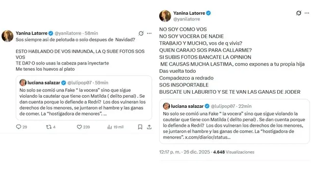 Desde su lugar, Yanina Latorre recogió el guante y lanzó un durísimo descargo público: “Sos siempre asi de pelotuda o solo despues de Navidad? ESTOY HABLANDO DE VOS INMUNDA, LA Q SUBE FOTOS SOS VOS. TE DA? O solo usas la cabeza para inyectarte. Me tenes los huevos al plato”. Pero no se quedó ahí y profundizó su ataque con una seguidilla de acusaciones personales: “No soy como vos. No soy vocera de nadie. Trabajo y mucho, ¿vos de qué viví? ¿Quién carajo sos para callarme? Si subís fotos, bancate la opinión. Me causás mucha lástima, cómo exponés a tu propia hija. Das vuelta todo. Cmpdezco a (Martín) Redrado. Sos insoportable. Buscate un laburito y se te van las ganas de joder”.