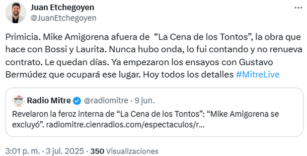 "Primicia. Mike Amigorena afuera de La Cena de los Tontos, la obra que hace con Bossi y Laurita. Nunca hubo onda, lo fui contando y no renueva contrato. Le quedan días. Ya empezaron los ensayos con Gustavo Bermúdez que ocupará ese lugar. Hoy todos los detalles #MitreLive", indicó el comunicador.
