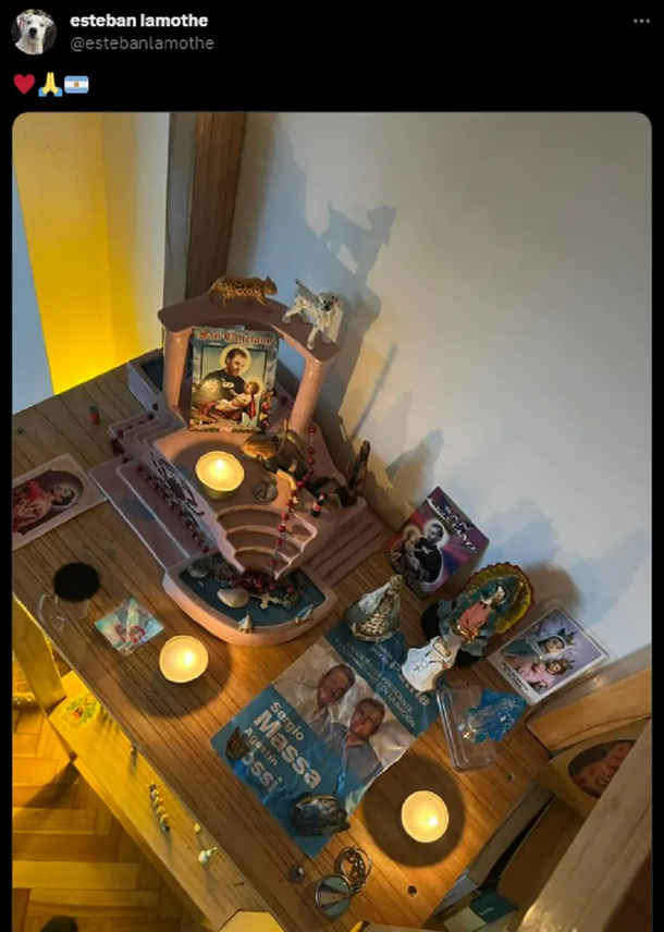 Mediante su cuenta de X, Esteban Lamothe compartió una fotografía de su altar. En el mismo se pueden observar distintas estampitas de algunos santos como San Cayetano, San Expedito y la virgen. Asimismo, se pueden ver algunas velas y un rosario con un ambiente completamente oscuro en el que sólo brilla la luz de la vela.