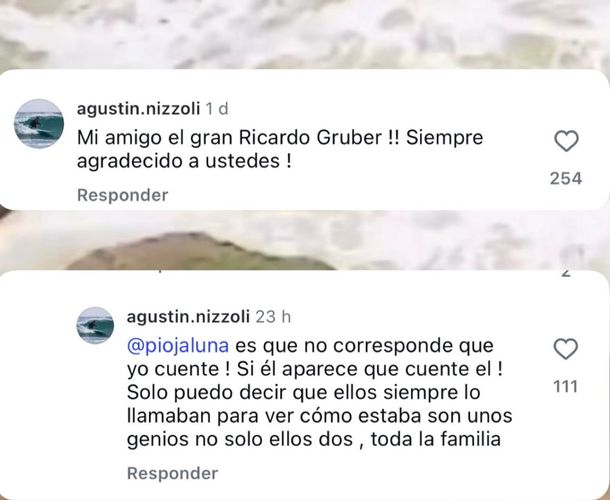Entre tantos comentarios en la publicación que alcanzó los 444 mil me gusta , 12,4 de comentarios y más de 6000 reposteos, salió a la luz el nombre del que ese día tuvo "un final feliz", se trata de Ricardo Gruber, y así lo mencionaba el usuario @agustin.nizzoli de esta manera: "Mi amigo el gran Ricardo Gruber!! Siempre agradecido a ustedes" y ante la insistencia de varios usuarios preguntando que fue lo que pasó después con Gruber, escribió arrobando a uno de los tantos curiosos: "@piojaluna es que no corresponde que yo cuente. Si él aparece, que cuente él. Solo puedo decir que ellos lo llamaban para ver como estaba, son unos genios, no solo ellos dos, toda la familia".