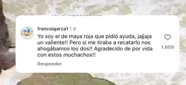 También apareció uno de los protagonistas del video y es quien pide ayuda, el usuario @francoigarza1 escribió: "Yo soy el de maya roja que pidió ayuda, jajaja un valiente!! Pero si me tiraba a rescatarlo nos ahogabamos los dos!! Agradecido de por vida con estos muchachos!!".