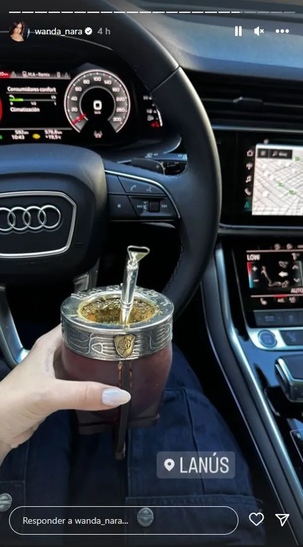 Wanda compartió una foto desde el auto con un mate en la mano y la ubicación de Lanús. Acto seguido, publicó dos grabaciones del partido: en una de ellas se la escuchó alentar al mayor de sus hijos y la otra la musicalizó con “Y vamos Millonarios”.