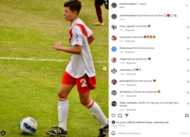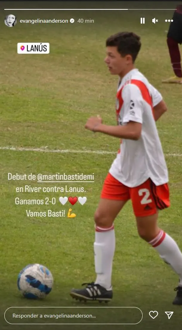 Por su parte, Evangelina compartió una foto de su hijo en pleno partido y escribió: “Debut de Bastian en River contra Lanús. Ganamos 2 a 0. Vamos Basti”.