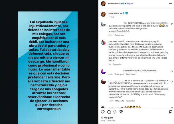 Evelyn Von Brocke también eligió las redes sociales para expresar su versión de los hechos luego de ser expulsada de APTRA, en una decisión que generó un fuerte sacudón en el ambiente del periodismo de espectáculos. A través de un extenso descargo, la periodista afirmó haber sido víctima de una expulsión “injusta e injustificable” y aseguró que llevará el caso a la Justicia para defender su nombre y su trayectoria profesional.