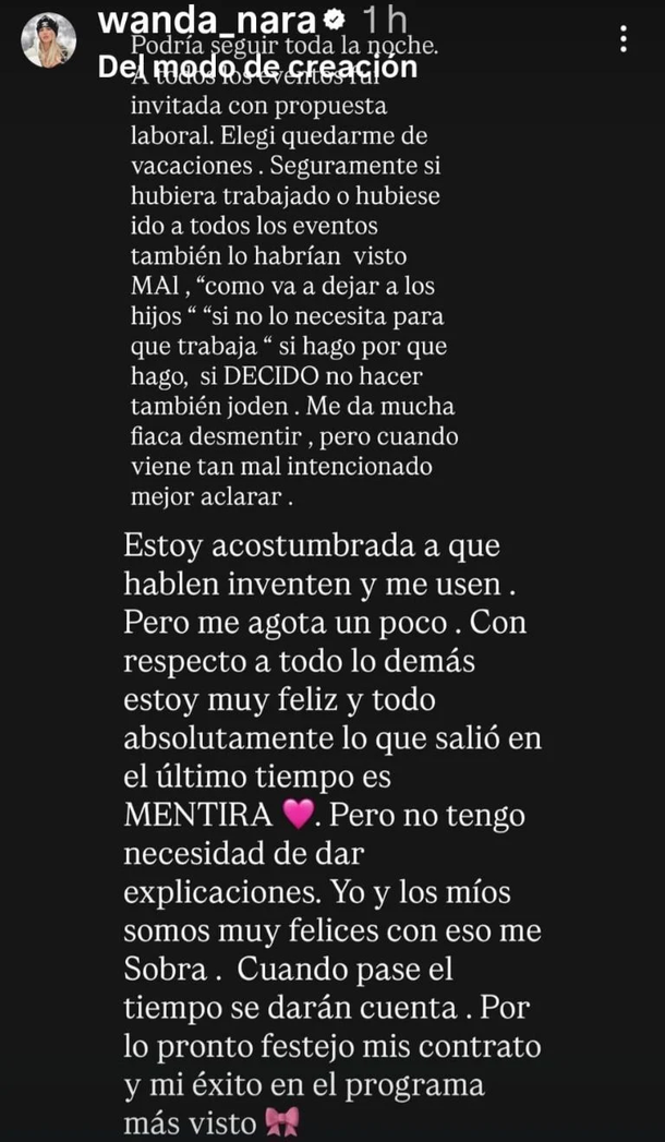 Frente a ese escenario, decidió hablar en primera persona y dar su versión, aunque uno de sus posteos terminó generando una polémica aún mayor. Antes de la frase que desató el escándalo, Wanda intentó aclarar el contexto de su verano: “Tuve unas vacaciones hermosas. Gracias por entender que este verano viajé con toda mi familia y preferí disfrutar de ellos y no ir a todos los eventos que fui invitada”, escribió, buscando desmentir que su ausencia en la movida esteña estuviera vinculada a un supuesto desplante del ambiente.