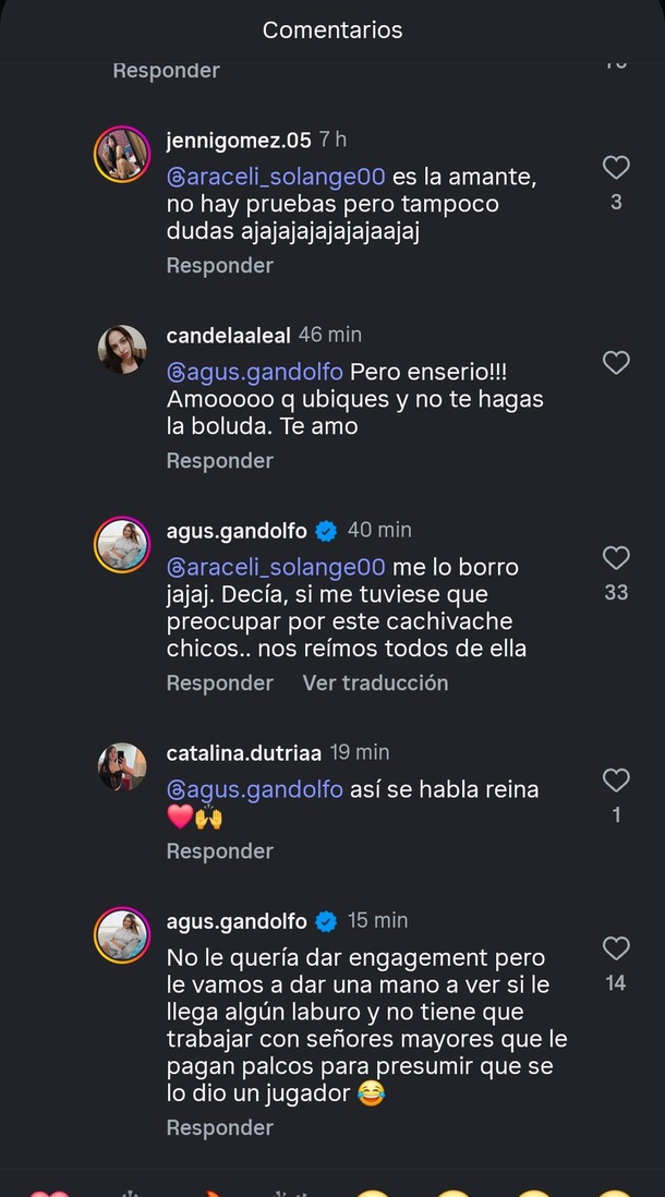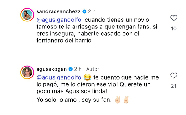 Horas más tarde, Gandolfo bajó un poco el tono y publicó otra historia: “Volvemos a la transmisión normal. Ya cada uno en su lugar jajaja. Disculpando por ser tan atrevida. Yo las amo igual, son tremendas”. Kogan, lejos de enojarse, respondió con humor y aclaración: “Te cuento que nadie me lo pagó, me lo dieron ese VIP. Querete un poco más Agus, sos linda! Yo solo lo amo, soy su fan”.