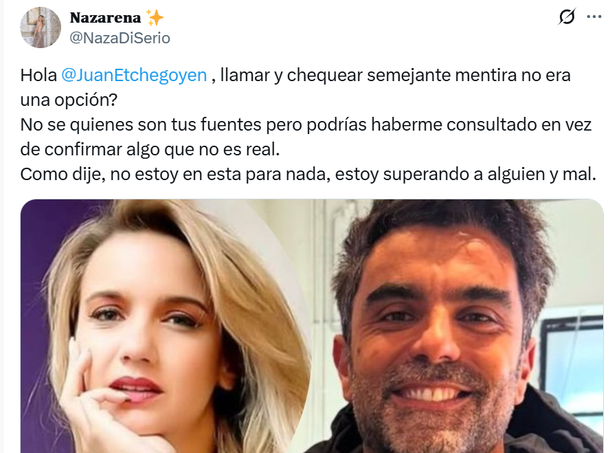 A través de su cuenta de X, Nazarena se ofendió por lo comentado por Etchegoyen y salió con un descargo furioso contra el comunicador.