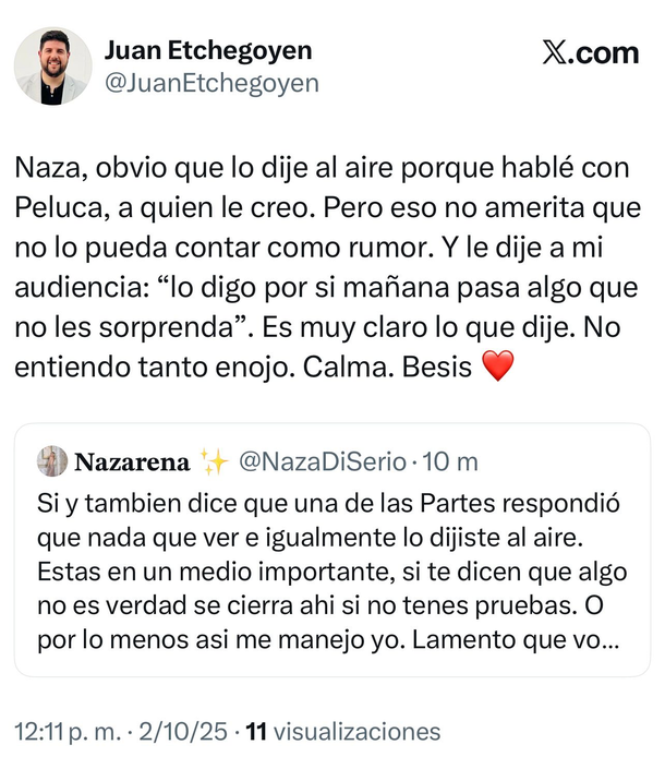 “Hay que leer bien la nota y no quedarse con el título”, le respondió el periodista de radio Mitre y la TV Pública, a Naza Di Serio. ¿Habrá más cruces?