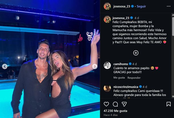 Días antes, él mismo le había dedicado un posteo en redes con un mensaje amoroso: "Feliz cumpleaños bebita, mi compañera, mujer bomba y la mamucha más hermosa. ¡Feliz vida y que sigamos recorriendo este hermoso camino juntos con Salud, mucho amor y paz! que seas muy feliz. ¡Te amo!".